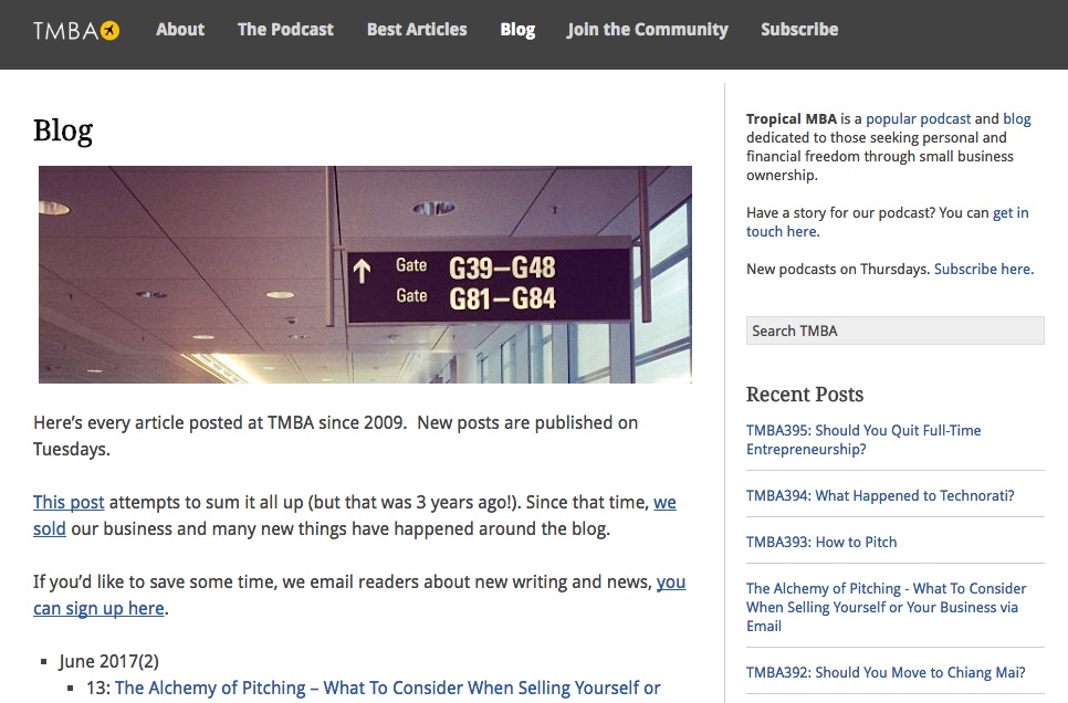 One of the things that make Tim’s blog so great is that it is friendly and open, like a friend welcoming you to their home. You find out a bit about Tim and his business partner at the beginning; then you get a snackable bit of content in the form of podcasts underneath the basic information. There is an outline of what the podcast episodes are about above the podcast, and this appeals to people who are looking for information on what the podcast is about.