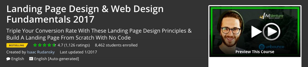 Landing Page Design & Web Design Fundamentals 2017 by Isaac Rudansky, features techniques to design a “highly converting page without a single line of code.” The author of this Udemy course also gets into depth in some pretty important topics for online business site owners such as: