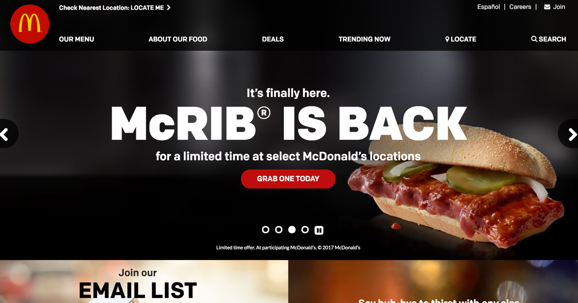 McDonald’s site makes you hungry. There are so many closeup images of their food and goodies that it’s hard to ignore. Right now, they have their main background with burgers and fries, but they have created the site in such a way that another moving panel comes to the forefront with their Peppermint Mocha, being front and center. Why do they do this? Obviously, because it is one of their “hottest” items during the cold winter and holiday season and they are gearing up for it. The photography of their food and drink items is superior, and this adds to the attractiveness of this site. They have also added to the look of the site by adding a four-panel graphic with clickable links to join their email list, get in a soft drink deal, explore their nutrition facts, and look at deals in their mobile app. With so many choices to choose from, McDonald’s has the corner on the market in fast food with this engaging site.