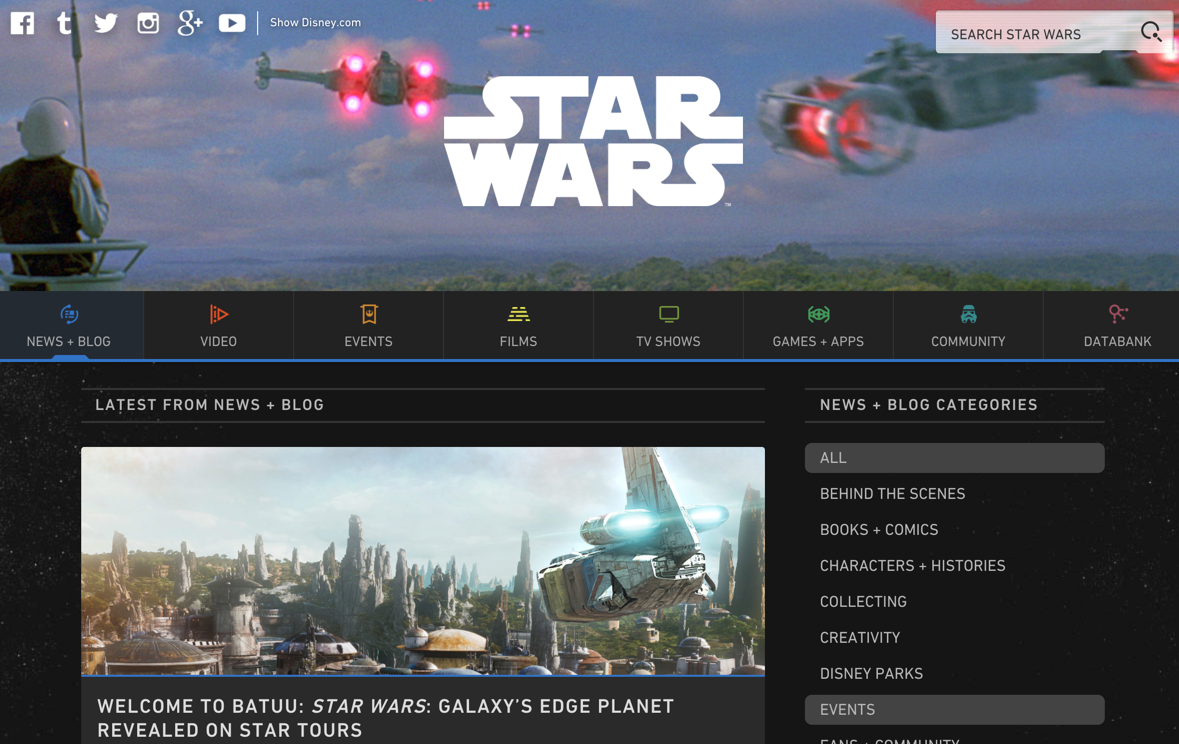 Another great website that was put up by the “Star Wars” people can be seen here. It is also a WordPress site. What makes it so great is the excellent use of their logo at the top of the page and the black color that is typical of the Star Wars movie background and other assets. They feature their blog on this site as well, and their navigation menu is extensive with many different links to different sites that allow you to buy merchandise, games, and apps.