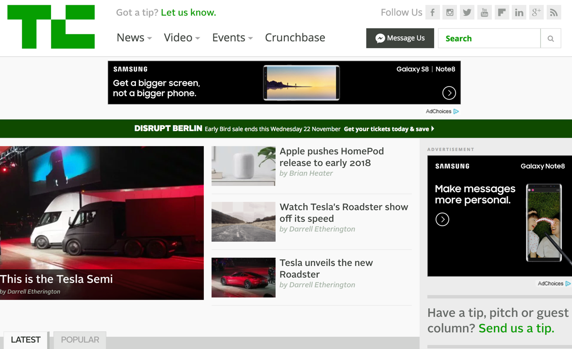 TechCrunch is a well-known British online publication that focuses on the world of technology. The look says, “Tech” and the logo works nicely with the brand, as well. Their site was built on WordPress, which is a good platform for online publications and it works nicely for this brand. The colors are predominantly white and green.